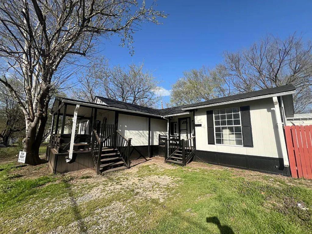 Recently renovated 4-bedroom, 2-bath manufactured home situated on a spacious 0.34-acre lot. The property is currently leased and tenant occupied. Located just minutes from Lake Texoma, this home offers easy access to water recreation and outdoor amenities. Recent updates include a new roof, new septic system, fresh interior and exterior paint, central air conditioning, washer and dryer hookups, and a detached storage shed. Interior photos are virtually staged to illustrate potential layout options. The large front and back yards provide ample space for outdoor activities, gatherings, or additional storage. Off-street parking allows room for boats, RVs, trailers, or equipment. With four bedrooms and a generous lot, this home is ideal for larger households, multi-generational living, or buyers seeking flexible indoor-outdoor space near the lake. Buyer and buyer’s agent to verify all information including square footage, schools, and property details.